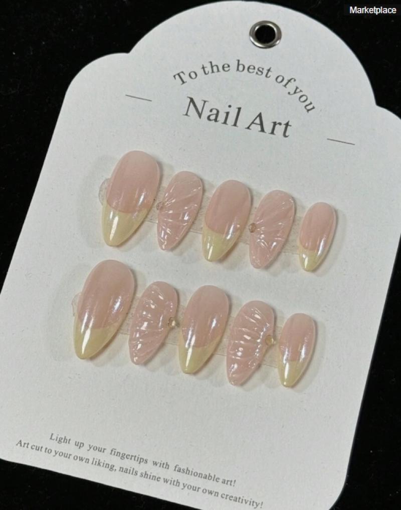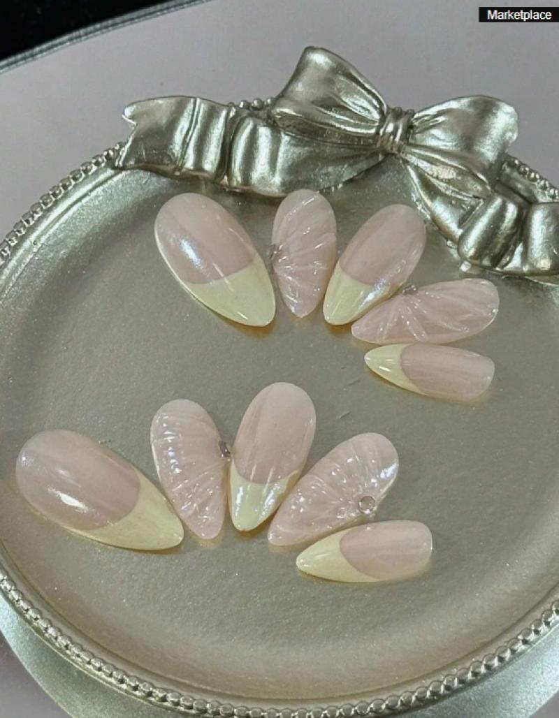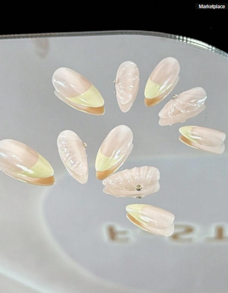 قطع من الأظافر الصناعية الفرنسية على شكل لوز مصنوعة يدويًا مع ديكور ماسي كريستالي ثلاثي الأبعاد