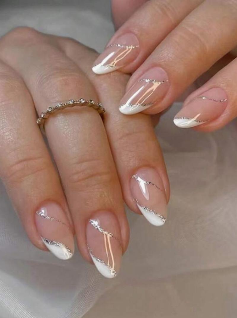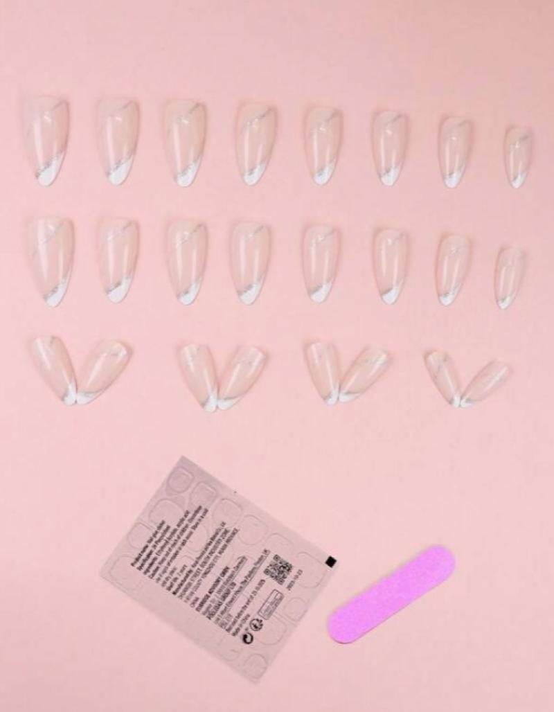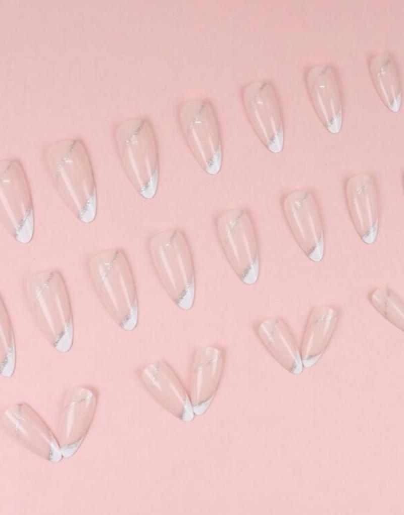 24 قطعة على شكل لوز أنيقة ومبسطة وردي على الطراز الفرنسي بريق وتصميم شريط يمكن ارتداؤها الأظافر وهمية لارتداء اليومية والحفلات اضغط على الأظافر مسمار اللوازم