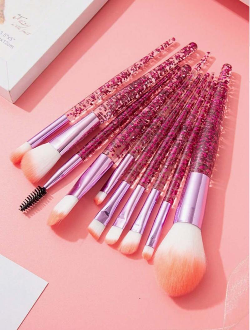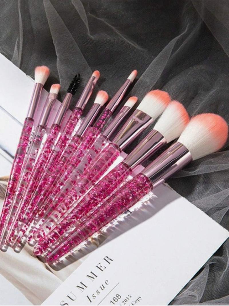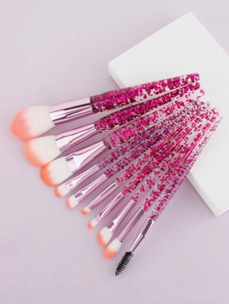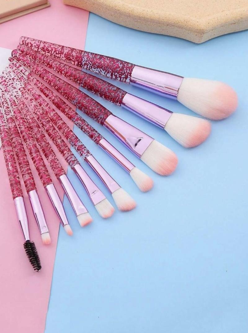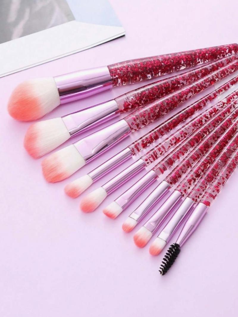 10 قطع واضحة كريستال وتدفق الرمال ماكياج فرشاة مجموعة، بما في ذلك فرشاة عينيه، فرشاة أحمر الخدود، فرشاة مسحوق فضفاضة، الخ.