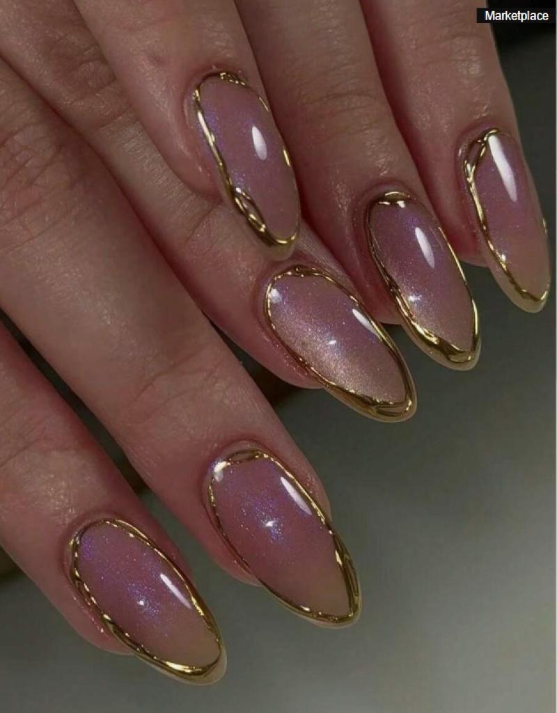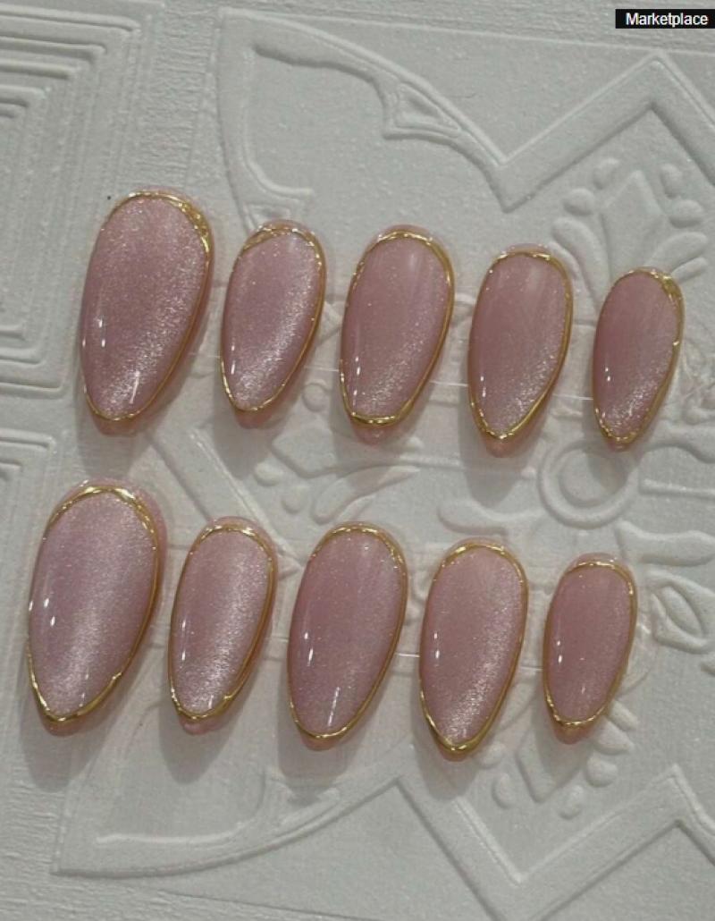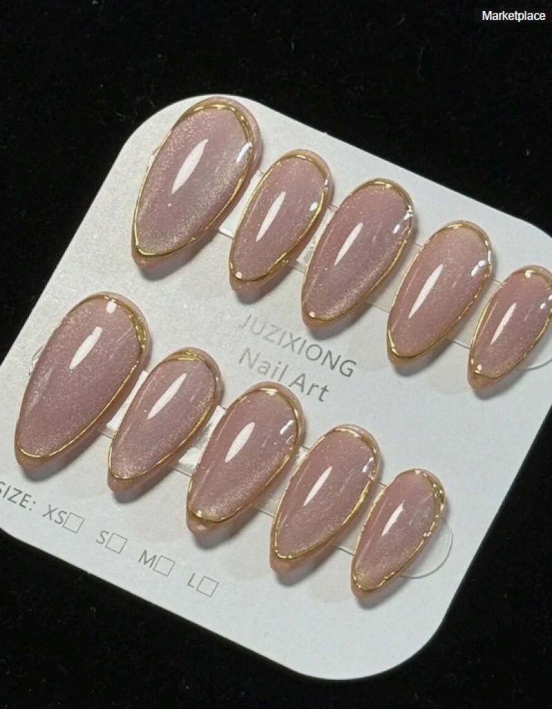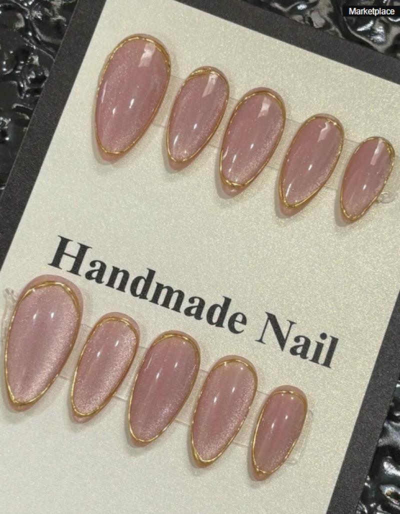 10 قطع من الأظافر الصناعية المصنوعة يدويًا على شكل لوز مع عين القطة الوردية ومسحوق ذهبي لامع، عصرية وراقية